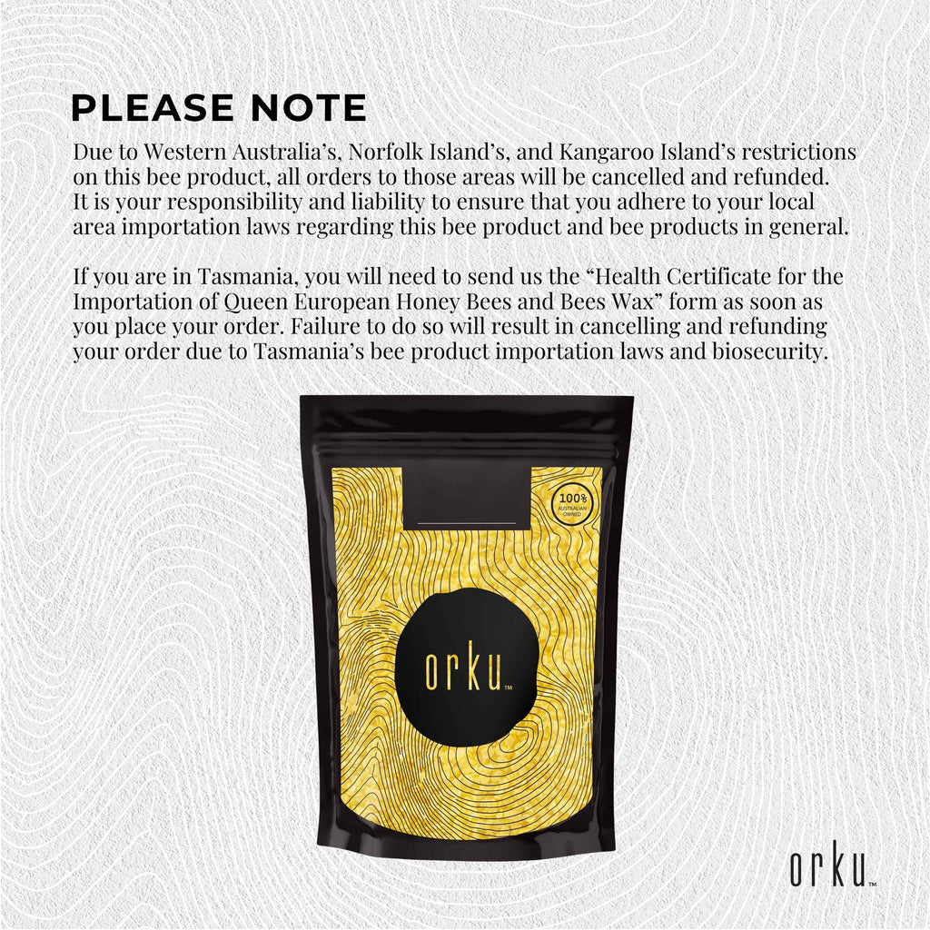 Due to Western Australia’s, Norfolk Island’s, and Kangaroo Island’s restrictions on this bee product, all orders to those areas will be cancelled and refunded.