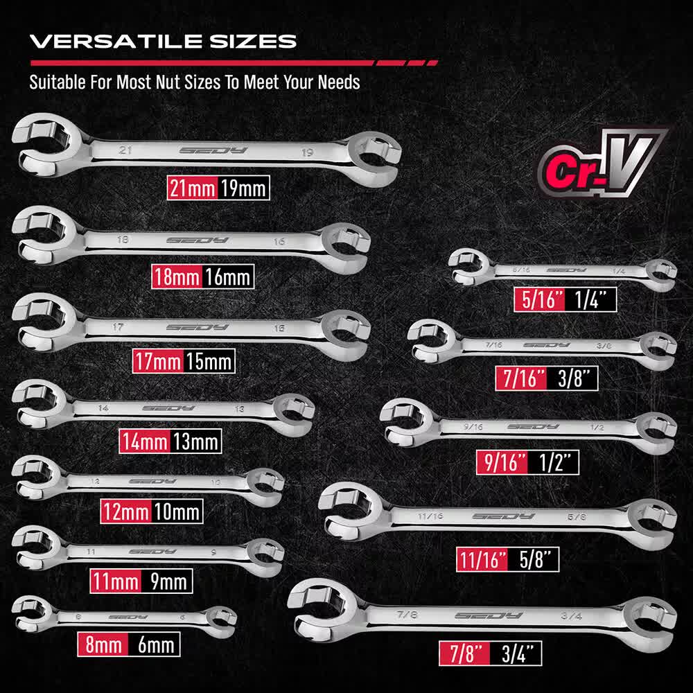 VERSATILE SIZES This practical set includes 12 pieces with both SAE and Metric sizes, covering the most common sizes for automotive and plumbing repairs. With wrench sizes ranging from 1/4" to 7/8" and 9mm to 21mm, it provides everything you need for brake line repairs and nut removal with precision.