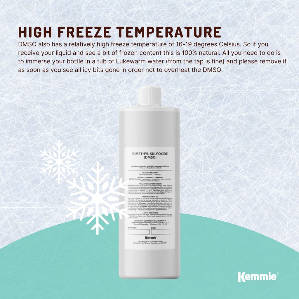 DMSO is a very temperature sensitive product. Liquid DMSO can and will crystallise in a cold environment. If this occurs, place or keep the DMSO bottle in a warm location (15°C – 20°C), and within a few hours it should go back to liquid form. For faster results, place the bottle in a clean zip lock bag, seal it, and place it in warm water. Under any circumstances, do not microwave it!