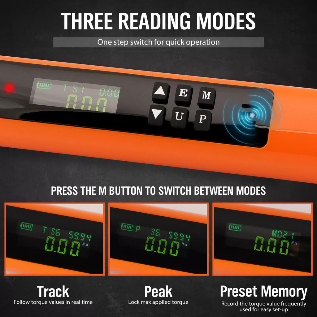 Streamlined Efficiency: The reversible ratchet head allows for quick socket disassembly and installation with just one hand, improving work efficiency and saving you valuable time. With three working modes - real-time, peak, and preset memory - you can choose the mode that suits your needs for efficient and fast operations. Experience the convenience and efficiency of our torque wrench now!