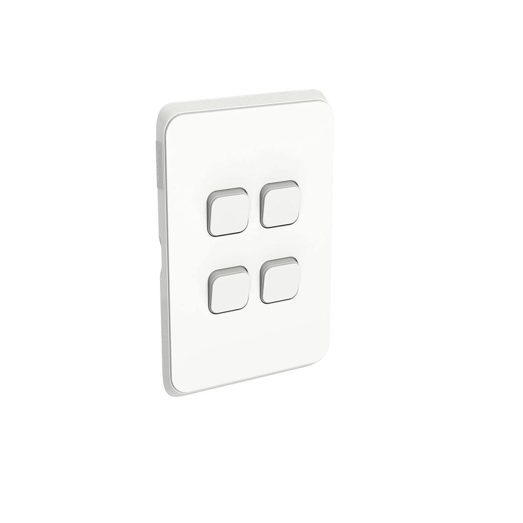 Clipsal 3000 Series 4 Gang, 250V, 10Ax1-Way/2-Way Vertical Mount Iconic Flush Switch is a versatile 3 gang smart light switch assembly with 2-way functionality. This flush-mounted Clipsal 3 gang switch is great for residential use, and ideal for large spaces and staircases. O rings prevent screws dislodging during transportation. Protective flaps help prevent direct access to the screws after installation. Specifications: Range: Clipsal Iconic; Product or component type: switch; Device application: lighting; Colour tint: vivid white; Sustainable offer status: Green Premium product; Load type: fluorescent 10 A; LEDi lamp 100 W; Quantity per set: set of 20; Device presentation: complete product; Control type: rocker; Device mounting: flush; Installation direction: vertical; Switch function: 1-pole 1/2-way; Number of rocker: 4; Rated current: 10 A; [Ue] rated operational voltage: 250 V; Height: 120 mm; Width: 78 mm; Depth: 39 mm; Net weight: 0.124 kg; REACh Regulation: Reference contains Substances of Very High Concern above the threshold; EU RoHS Directive: Compliant; Mercury free: Yes; RoHS exemption information: Yes; China RoHS Regulation: Product out of China RoHS scope. Substance declaration for your information; Environmental Disclosure: ENVPEP1607003EN; Material: plastic.