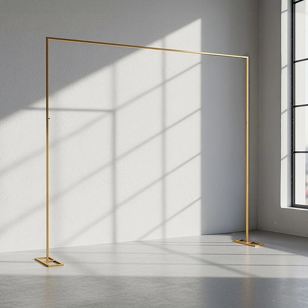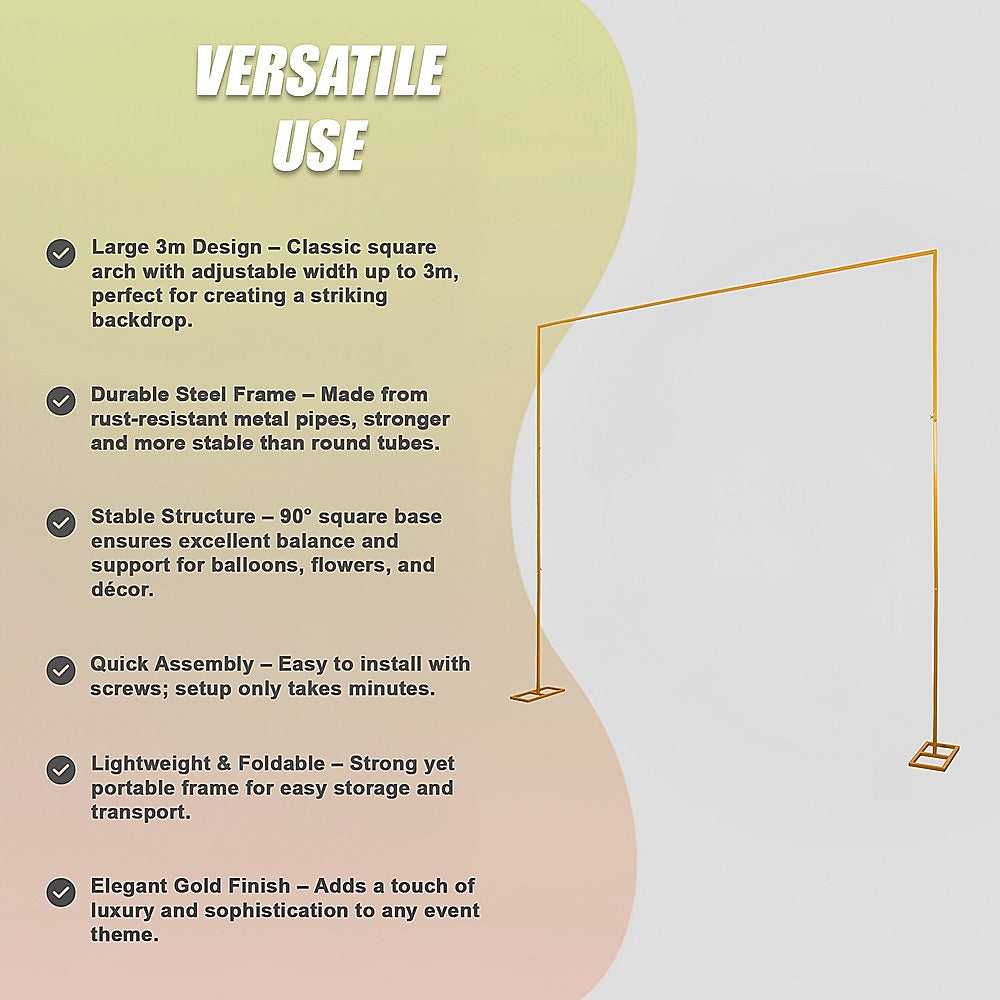 Transform any occasion into an unforgettable event with this 3m Square Wedding Arch Backdrop Stand. Finished in a classic gold colour, this elegant arch is perfect for weddings, engagements, birthdays, parties, and seasonal celebrations. Its adjustable width of up to 3m allows you to create a stunning backdrop tailored to your space, while the sturdy square steel frame provides reliable support for balloons, flowers, greenery, fabric, and other decorations.