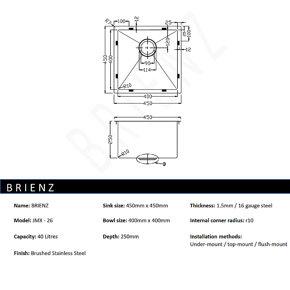 450x450mm Handmade Stainless Steel Undermount / Topmount Kitchen Laundry Sink with Waste