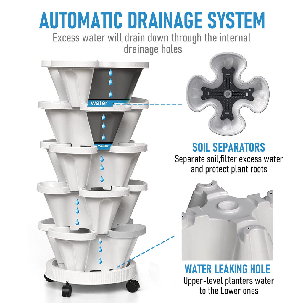 5 Tier Stackable Planter Pots Vertical Garden Stacking Space Saving High Yield Ideal for Herbs Flower Plants Veggies With Wheel White 37cm Width