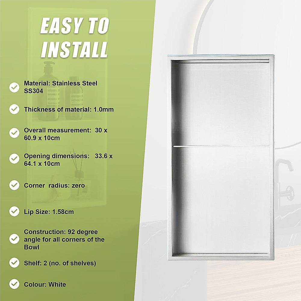 641 x 336 x 101mm Shower Niche Double Shelf Organizer No Tile Needed in White