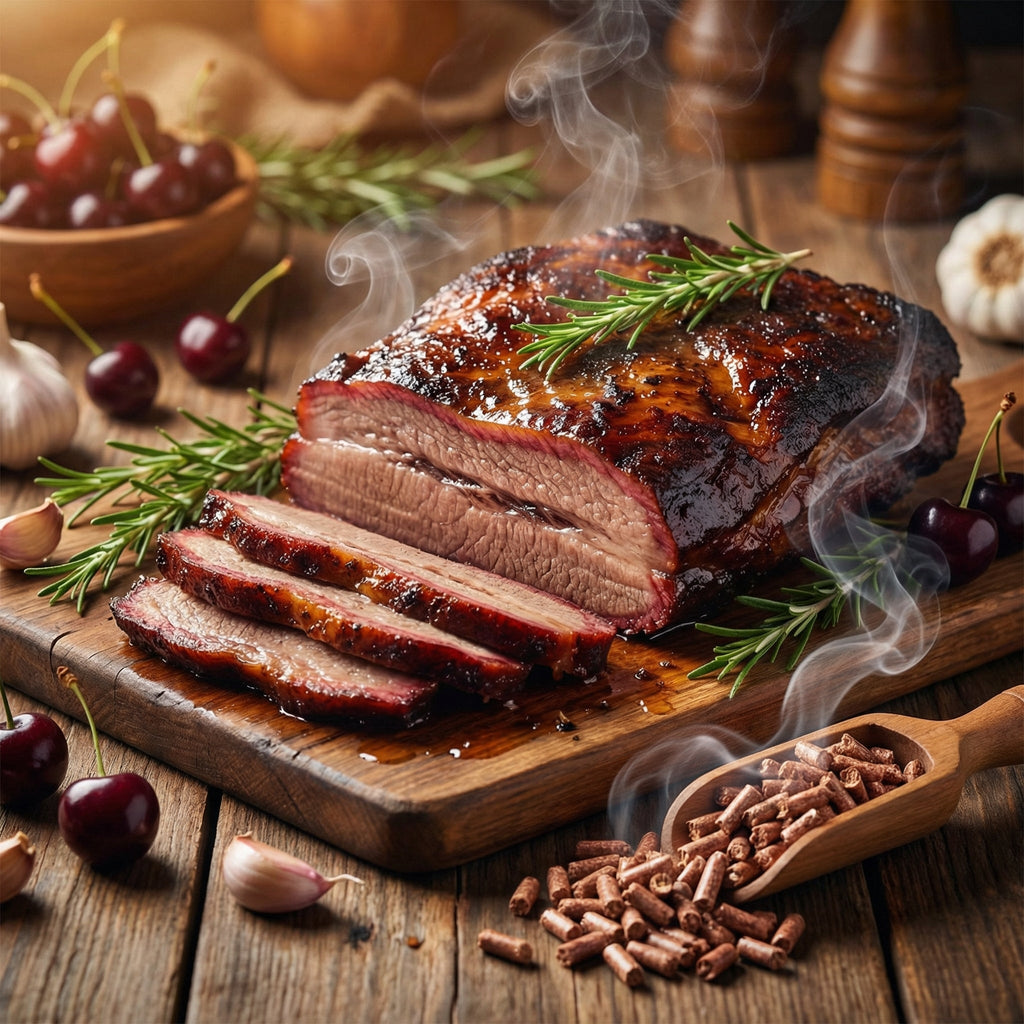 The Smoke Ring: Cherry wood reacts with meat proteins to create a stunning, deep-red smoke ring (the hallmark of great BBQ).