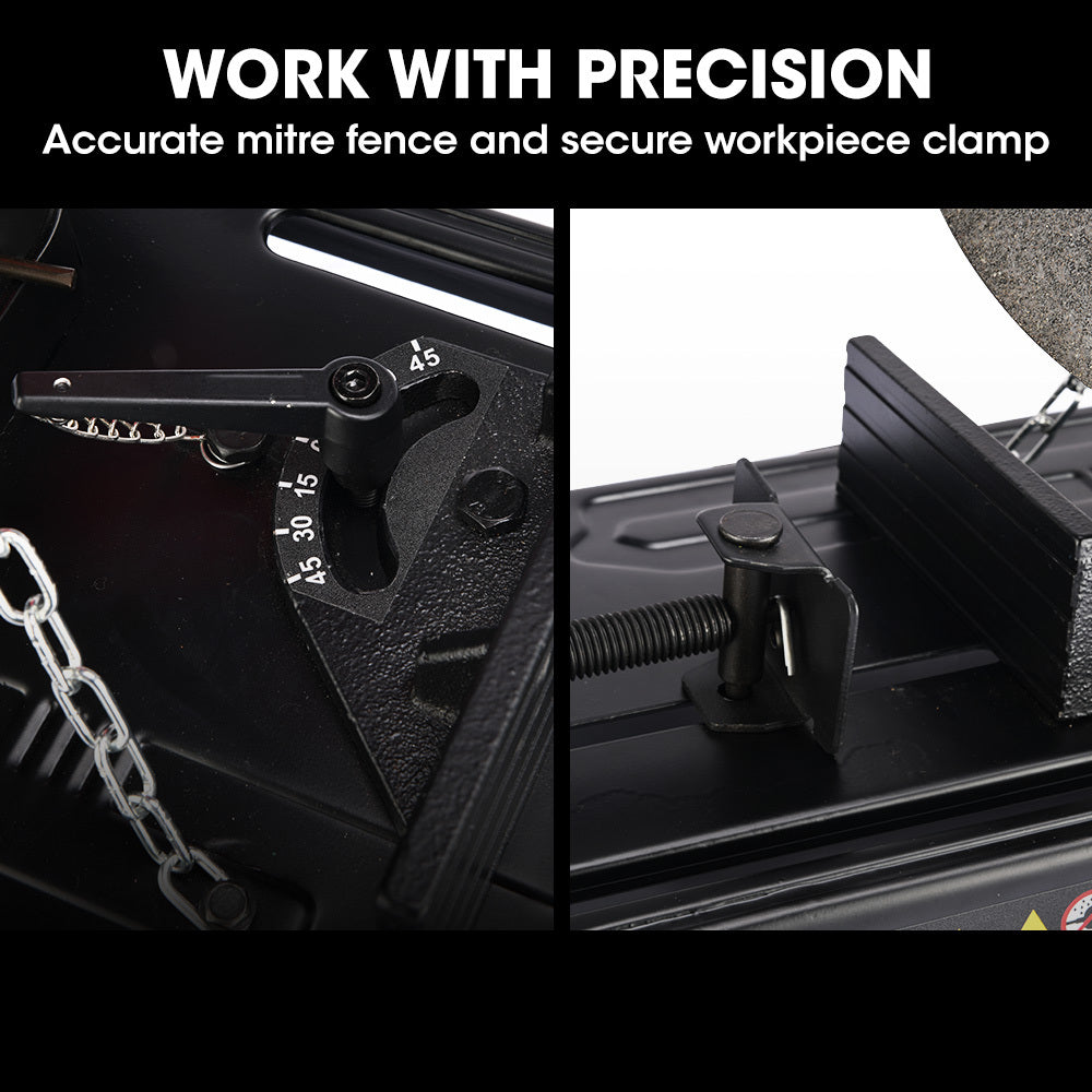 Experience cutting-edge performance with our 14-inch Dry-Cut Chop Saw, designed to keep up with the rigorous demands of modern construction and metalworking. Featuring a high-speed resin composite blade that has enhanced performance. Our saw provides better cuts and reduces the mess associated with traditional saws. This 355mm blade is capable of cutting materials up to a height of 125mm at 90 degrees and 75mm at 45 degrees.