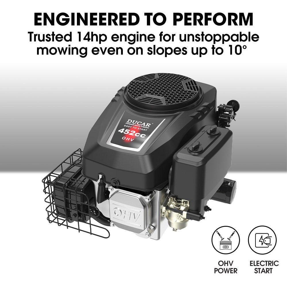 - Powerful Ducar 452cc OHV 14hp engine with electric key start