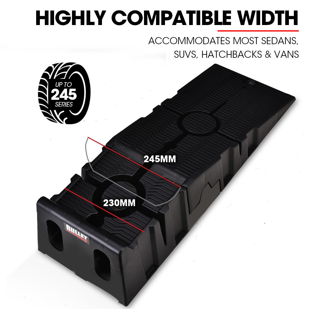 This pair of heavy-duty Bullet Car Ramps support an impressive 2500kg combined load and a maximum tyre width of 23cm, making them suitable for most vehicle types including vans, SUVs and 4WDs. Having exceeded strict TUV German certification standards, you can be assured that they offer the highest quality and safety credentials.