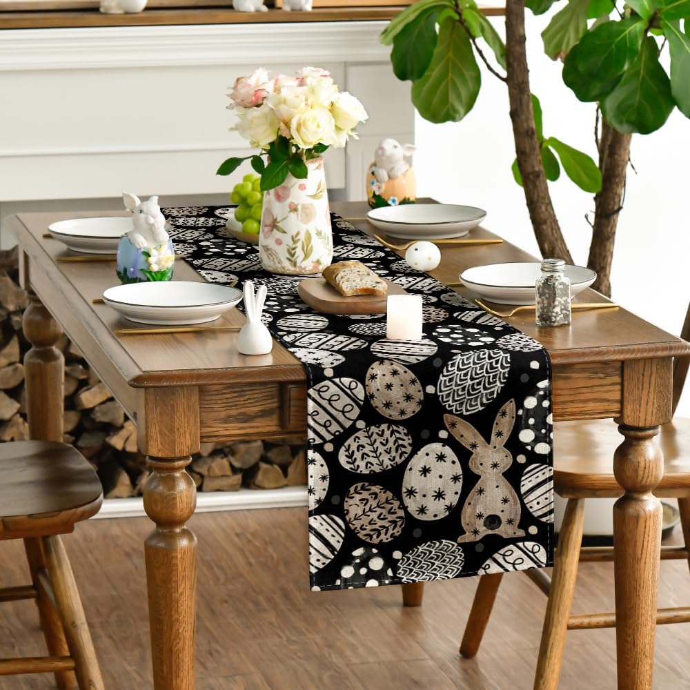 Bunny Rabbit Eggs Flowers Easter Table Runner, Seasonal Spring Kitchen Dining Table Decoration for Home Party Decor 13x72 Inch