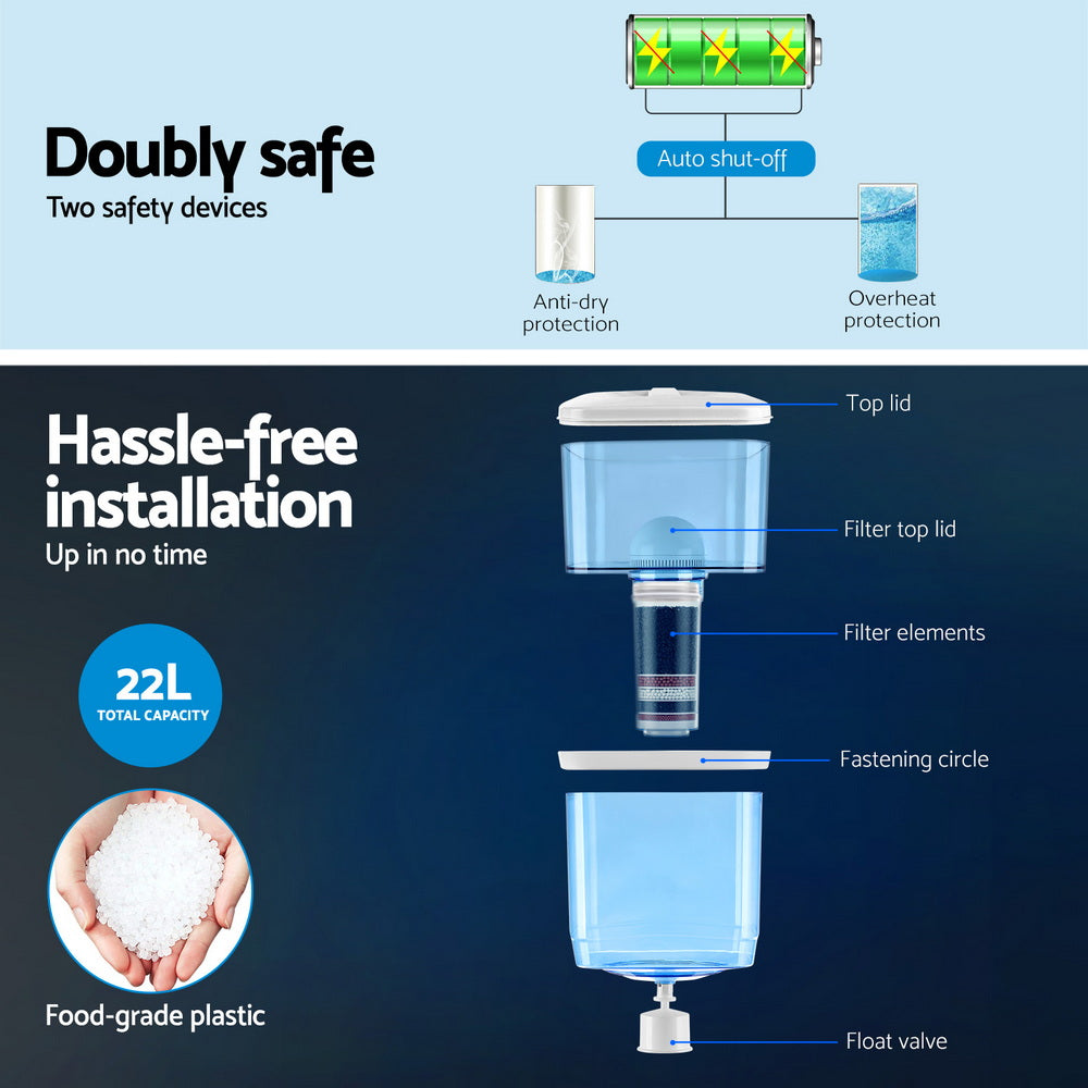 Filtered, clean and pure water on demand. With the Devanti Countertop Water Cooler, it could not be any easier. The large 22-litre water purifier container ensures that ample drinking water is always on call without hassle. Better still, the food-grade plastic container is refillable to ensure you can always have water anytime without having to wait for delivery of bottled water. Thanks to its 7-stage filtration system with two replacement filters that ensures your water tastes great and free of harmful chemicals and impurities. The cooler comes with three taps to deliver water at hot, cold or room temperature options. Plus, the cooler also comes with a smart detachable water guide plate that allows you to use bottled water if needed. The cooler is designed for safe use with protection against overheating, over-current, drying out and electric shocks. Not least, the cooler can be placed on any counter top for convenient use and the anti-slip feet ensure that the ensemble stays firmly in place.