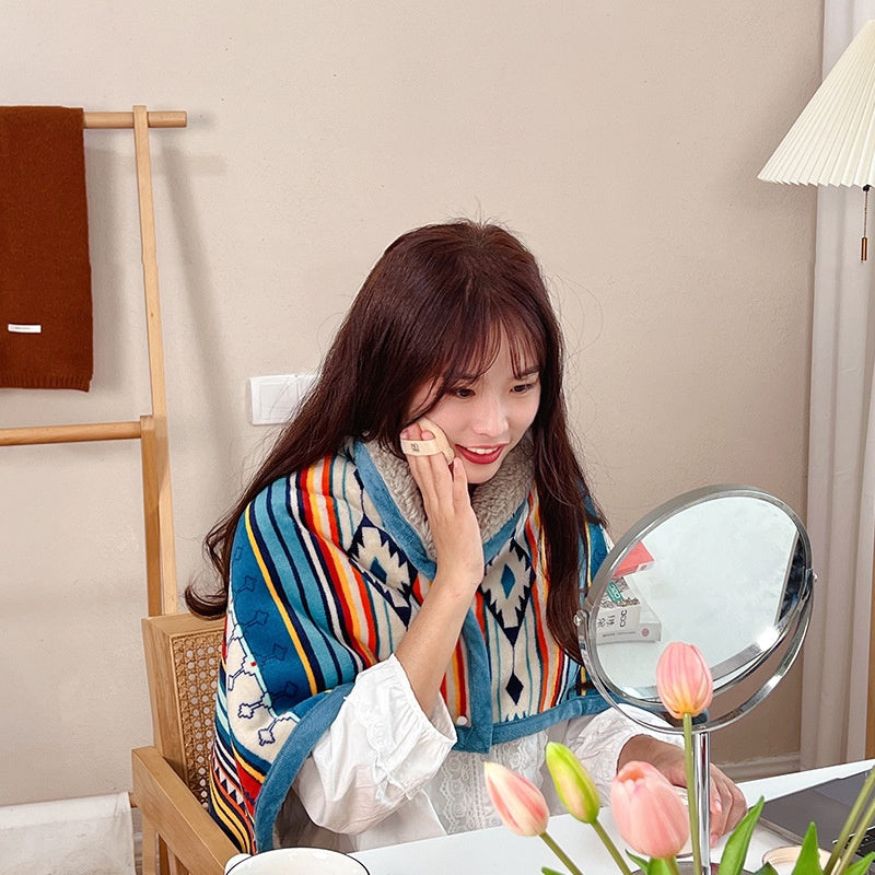 Double-Sided Geometric & Plush Throw Blanket - Warm 70x100cm Multi-Use Wrap Color stripes/Back side light brown