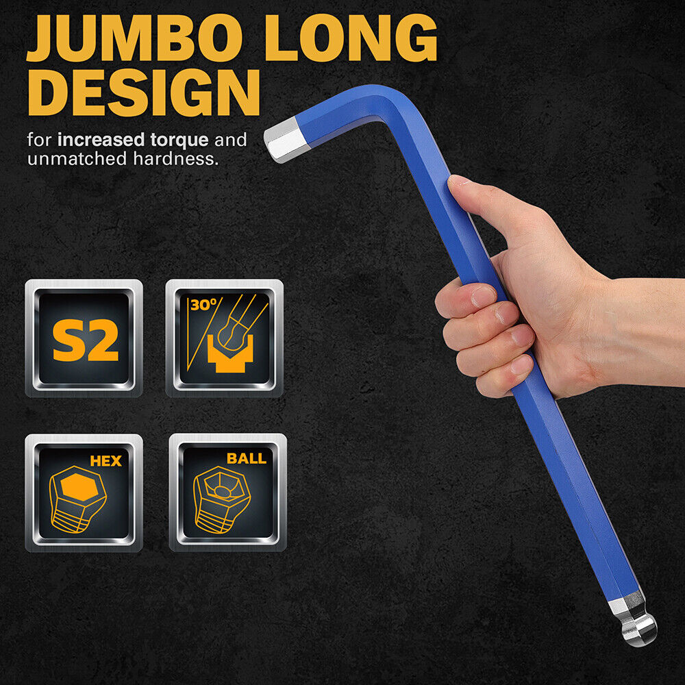 【COMPLETE SET】The 13 Piece Metric Jumbo Long Point Hex Key Wrench set is your comprehensive toolkit for all tightening and loosening needs. With sizes 2mm, 2.5mm, 3mm, 4mm, 5mm, 6mm, 7mm, 8mm, 10mm, 14mm, 17mm, 19mm, this set allen hex wrench keys fit a wide range of internal tools and sockets. Its long arm design ensures easy access to bolts in tight spaces.