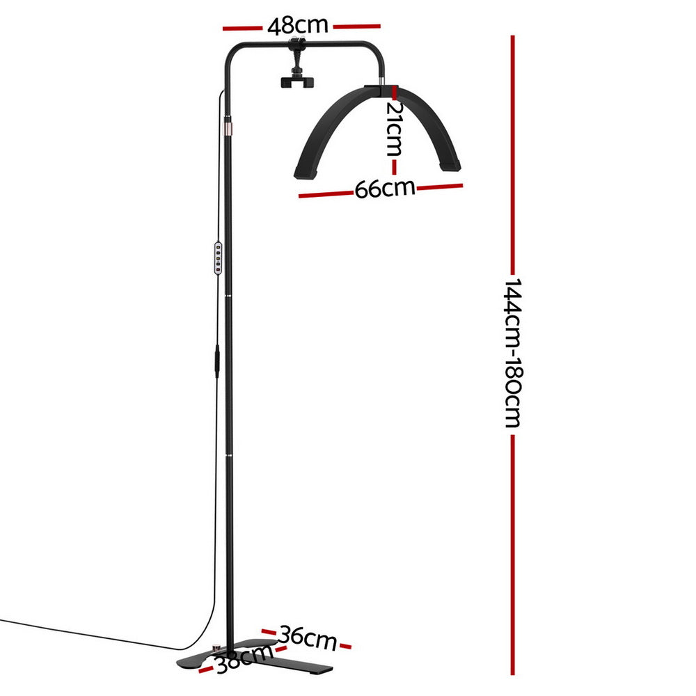 The Embellir Beauty Light LED Half Moon Lamp delivers professional-grade lighting for makeup application, lash extensions, and detailed beauty tasks. Its innovative half-moon design with 252 LED beads provides even, shadow-free illumination, while adjustable colour temperature (3000K-6000K) and brightness (10-100%) let you customize your lighting environment. Featuring flexible height adjustment (144-180cm), 360-degree rotation, and convenient remote control operation, this lightweight lamp is perfect for home salons and content creators. The included detachable phone holder adds versatility for recording tutorials or video calls.