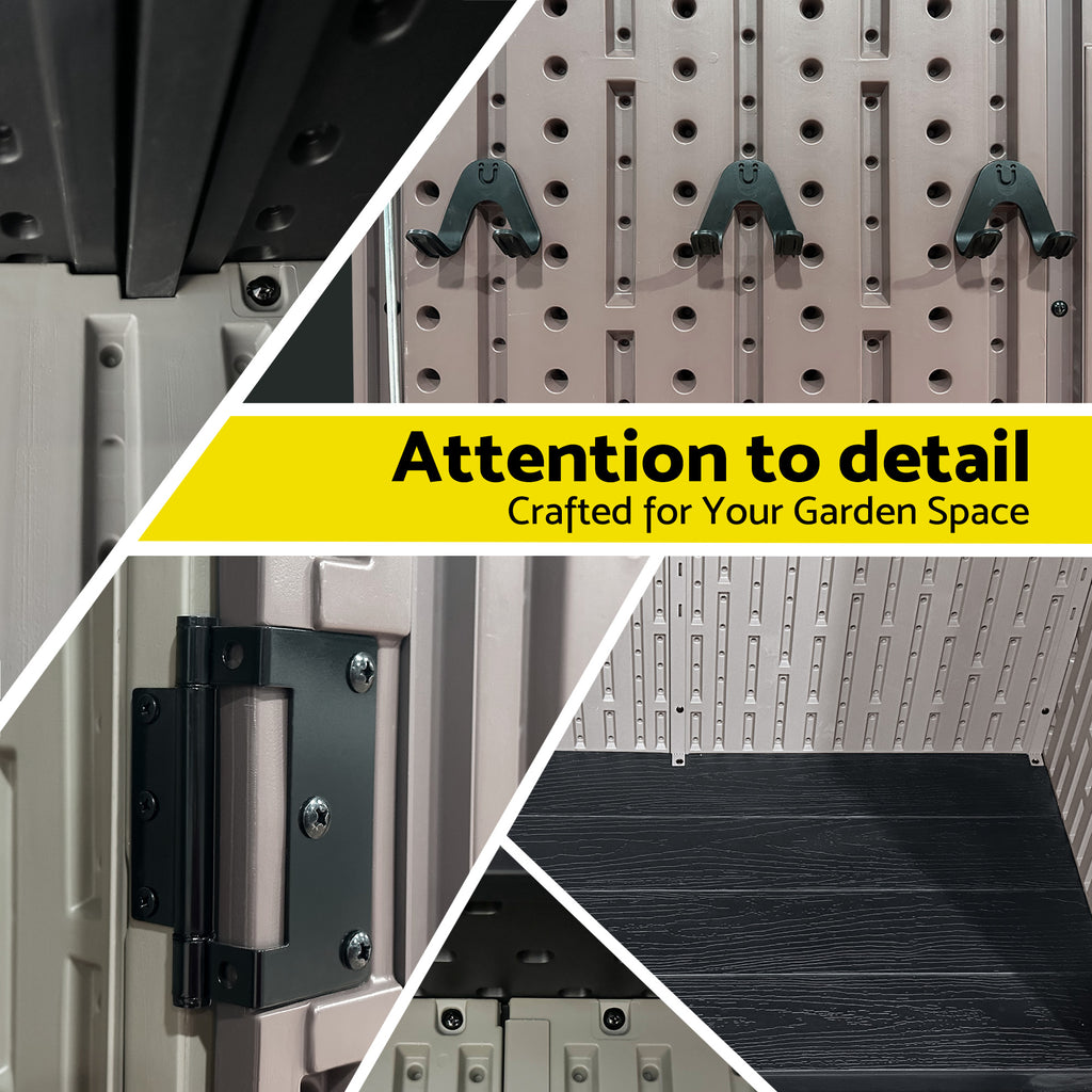 Keep your garden tools, equipment, and outdoor essentials secure and tidy with the Giantz Outdoor Storage Shed. Designed with the harsh climate in mind, this shed combines durability with a practical, maintenance-free design, making it the perfect addition to any backyard, patio, or garage.Constructed from heavy-duty HDPE resin, this shed is engineered for longevity. The core structure is reinforced with a robust steel frame that features a protective powder coating, ensuring the entire unit is corrosion-resistant and stands up to the elements without peeling or fading. The high-quality plastic floor provides a clean, stable, and dry base for all your stored items.Accessing your gear is simple and secure thanks to the double hinge doors. For peace of mind, the doors are lockable, allowing you to safely store valuable equipment. The functional sloped roof is designed to efficiently manage water runoff, preventing pooling and protecting the contents inside.Inside, the shed is designed for practical use. It includes 3 plastic hooks for hanging tools, hoses, or other accessories, helping you keep the space organised and clutter-free. The entire unit is designed for easy assembly, meaning you can set up your new storage solution quickly and get back to enjoying your outdoor space.