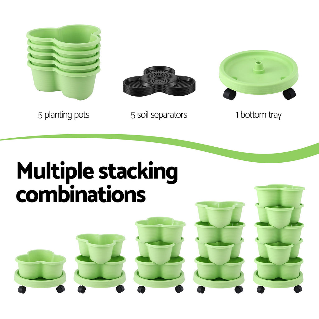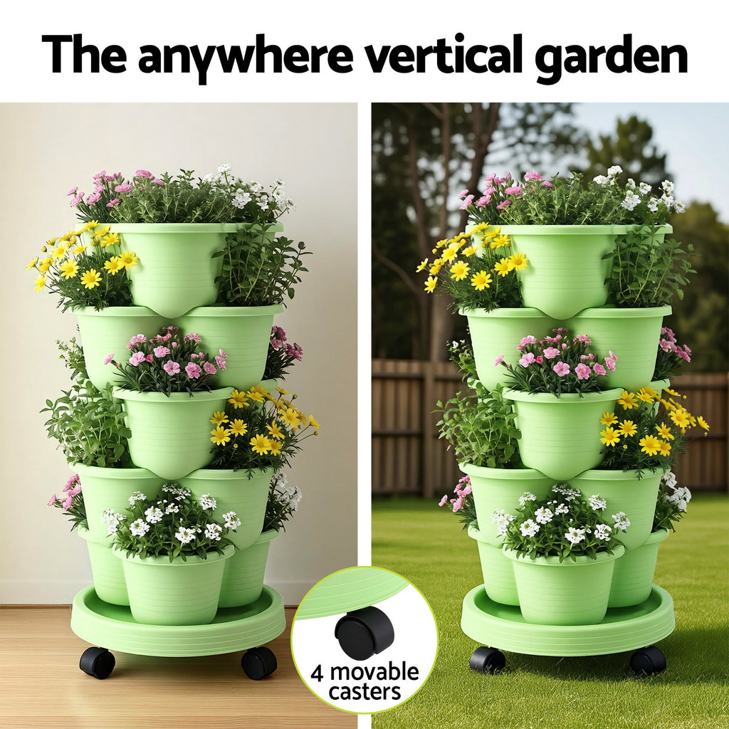 Green Fingers 5 Tier Vertical Garden Planter, Stackable Planters with Wheels, Light Green, Garden Bed, Garden Tower Indoor Outdoor, Auto Drainage System, for Strawberries, Herbs, Flowers, Vegetables