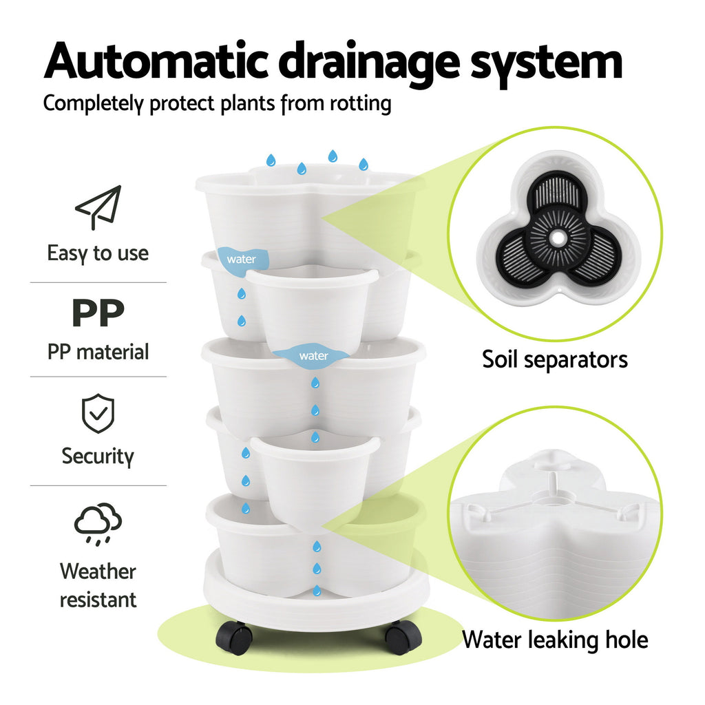 Green Fingers 5 Tier Vertical Garden Planter, Stackable Planters with Wheels, White, Garden Bed, Garden Tower Indoor Outdoor, Auto Drainage System, for Strawberries, Herbs, Flowers, Vegetables