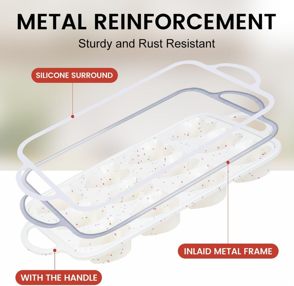 Inlaid Stainless Steel Frame: Upgraded heart silicone muffin pan has a hidden metal frame around the outer edge ensuring a sturdy structure that is steady. No more spiling after batter fill in with when transfer baking pan from counter to oven
