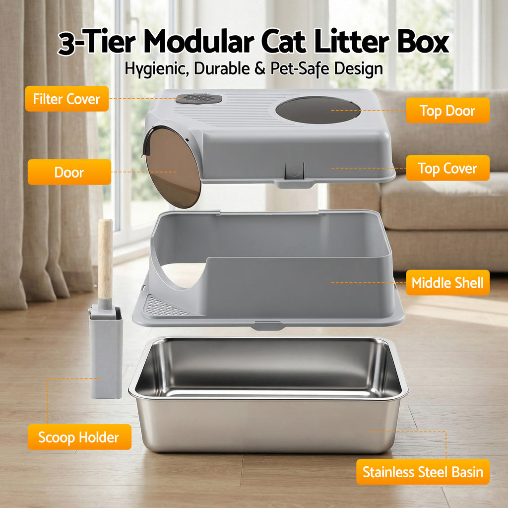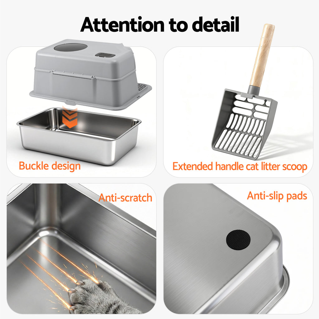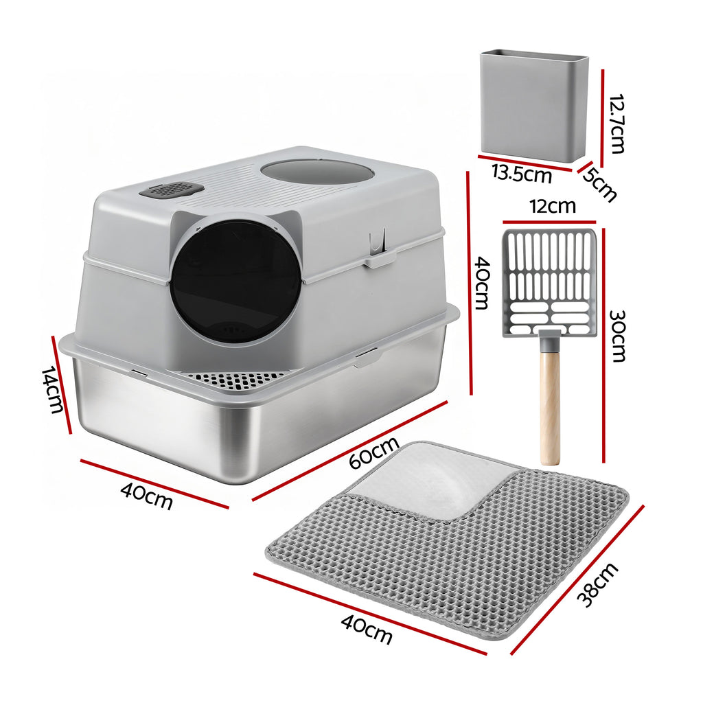 i.Pet Cat Litter Box Large Stainless Steel High Sided Pet Toilet Odour Control