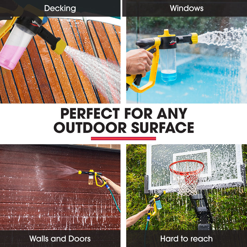 Unlike cheaper generic foam guns, we guarantee a rugged and leak-free design. Made from durable Thermoplastic Polymer this is an appliance made to last. Simply attach your Soap Gun to your standard half-inch threaded hose or use the included garden hose quick connector. The 240ml bottle capacity holds plenty of your favourite cleaning solution. The top knob adjusts your product flow to assure you get the right concentration of cleaning solution. The flow can also be turned off to rinse whatever surface you’re cleaning!