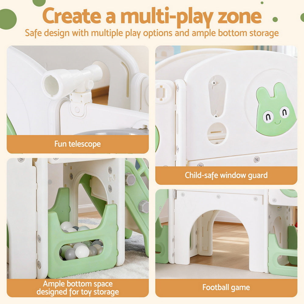 Keep your kids active and entertained with the Keezi 4-in-1 play set. It includes a child-safe swing, wide platform, fun telescope, and safety ladder for endless fun. Built from premium HDPE in stylish green and white, it features anti-slip steps, safe grip handles, and ample bottom space for toy storage. One ball and ring are included for added play. Easy to assemble and ideal for indoor or outdoor use. Note: Kids should be supervised by adults when using the swing.
