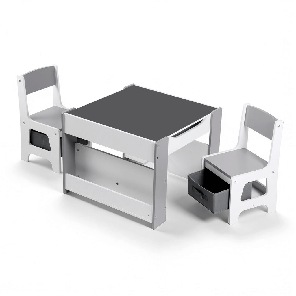 Keezi Kids Table and Chair Set, 4 in 1 Wooden Activity Table with Bookcase, Storage Box and Detachable Blackboard, Toddler Table and 2 Chairs Set, Grey