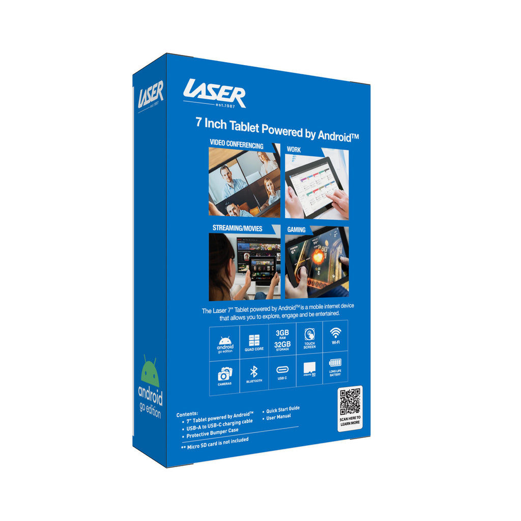 The Laser Android tablet runs on the less memory intensive Android Go operating system, which is powerful enough to run your everyday applications but is lean enough to extend battery life. This allows you to obtain more screen time and is the best bridge between your smartphone and your laptop.
