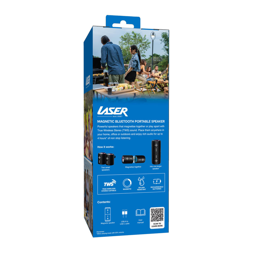 Meet the 2-in-1 speaker that changes shape with your sound. The Laser Magnetic Bluetooth Pill Speaker features two identical speakers that magnetically snap together into a single tower or pull apart for wide stereo separation. However you place them, the audio stays bold, clear, and balanced.