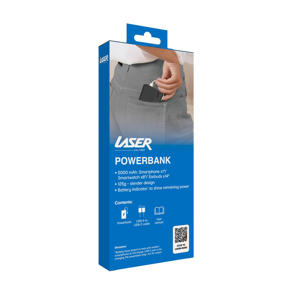 5,000mAh. Pocket-sized power: With enough capacity for up to 1.3 full phone charges*, this slim power bank keeps your essentials ready to go. From morning calls to evening playlists, its the everyday backup you can rely on.