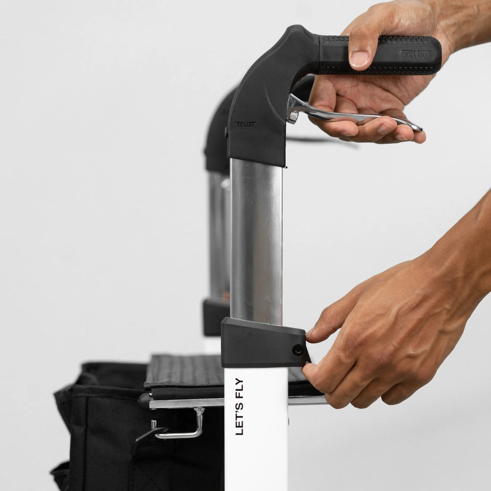 The ergonomically designed rubber handles on Let's Fly gives you a safe and comfortable grip. The handles have a small bump in front of your thumb to give extra support. Beneath the rubber grip is the brake handle that has a screw to adjust the brakes. The handles on Let's Fly are adjustable between 78,5-92 cm to suit different users. Lets fly gives you a comfortable walk wherever you decide to go.