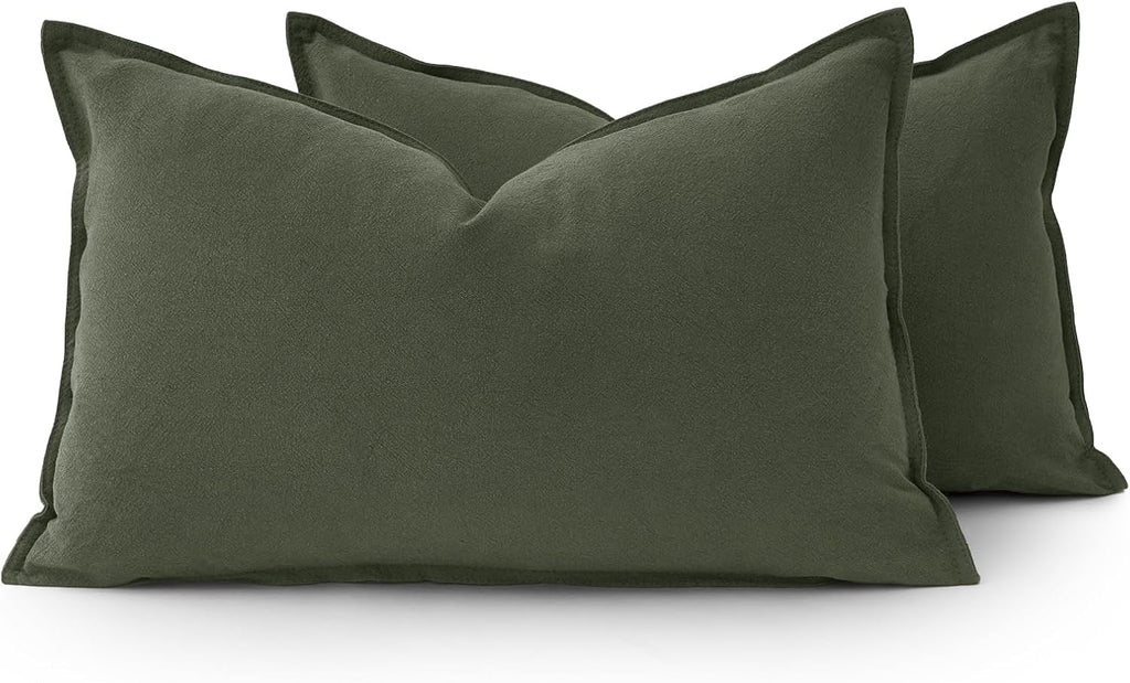 Linen Cushion Covers - 30% Linen 70% Cotton Blend, Soft & Breathable with Hidden Zipper Design - Khaki Green, 30cm x 50cm Twin Pack