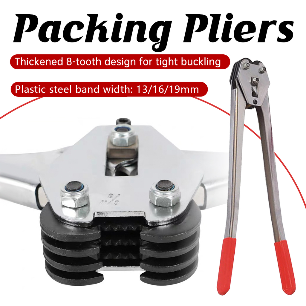 This manual strapping pliers tool is engineered for securing packages with ease and precision. Designed with an 8-tooth grip and anti-slip jaws, it offers firm buckling for a wide range of packaging applications. The reinforced steel structure ensures stability and durability, while ergonomic non-slip handles provide comfort and control. Suitable for warehouse operations, logistics packaging, or heavy-duty pallet binding, this tool improves efficiency and safety during strapping tasks.
