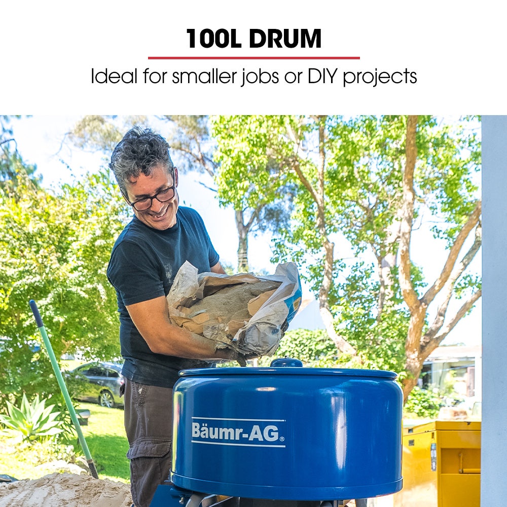 With a robust 100L heavy-gauge steel pan and a powder-coated frame and solid rubber wheels, this workhorse is built to endure tough job site conditions. At its core, a high-torque 1100W motor quietly powers the dual mixing arm at 23 RPM, ensuring a thorough and even blend of materials such as mortar, resin-bound aggregates, screed, grout, plaster, cement and more. Plus, the protective motor cover shields it from spills, keeping your mixer in top condition for the long haul.