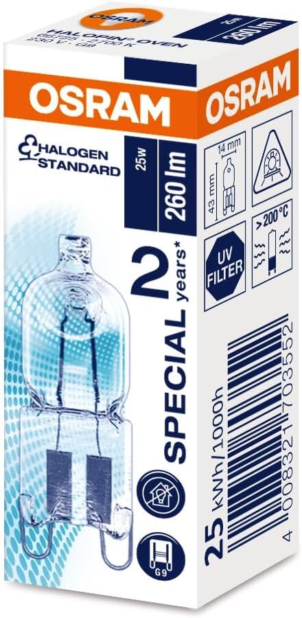 Product features: Average life: 2,000 h. Product benefits: Optimum halogen content for high temperatures. Contains no mercury. Areas of application: Baking ovens. Good all-around light emission, Incredibly small dimensions for revolutionary new luminaire designs.