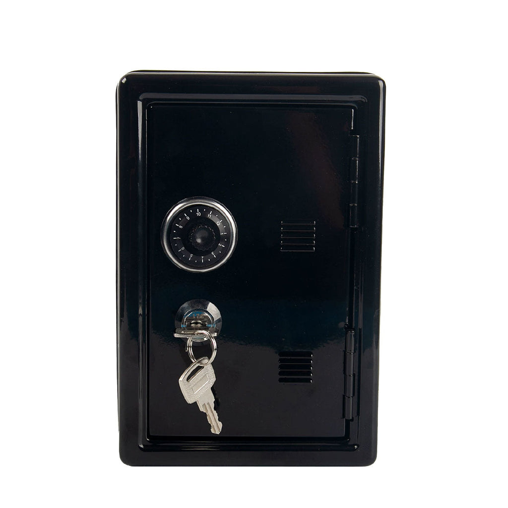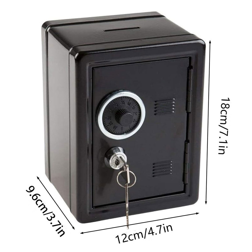 This sturdy piggy bank is made from durable metal, designed like a miniature safe with a functioning key and dial. Perfect for small household use, it provides a secure and fun way to store pocket money, coins, and small valuables.
