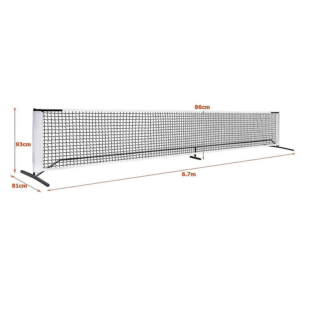 Take your pickleball game anywhere with this premium 6.7m portable net set. It features a tensioned rope system that keeps the net taut and straight, minimising sagging in the middle, even without an intermediate pole. The adjustable straps provide additional reinforcement, ensuring consistent net tension during play.