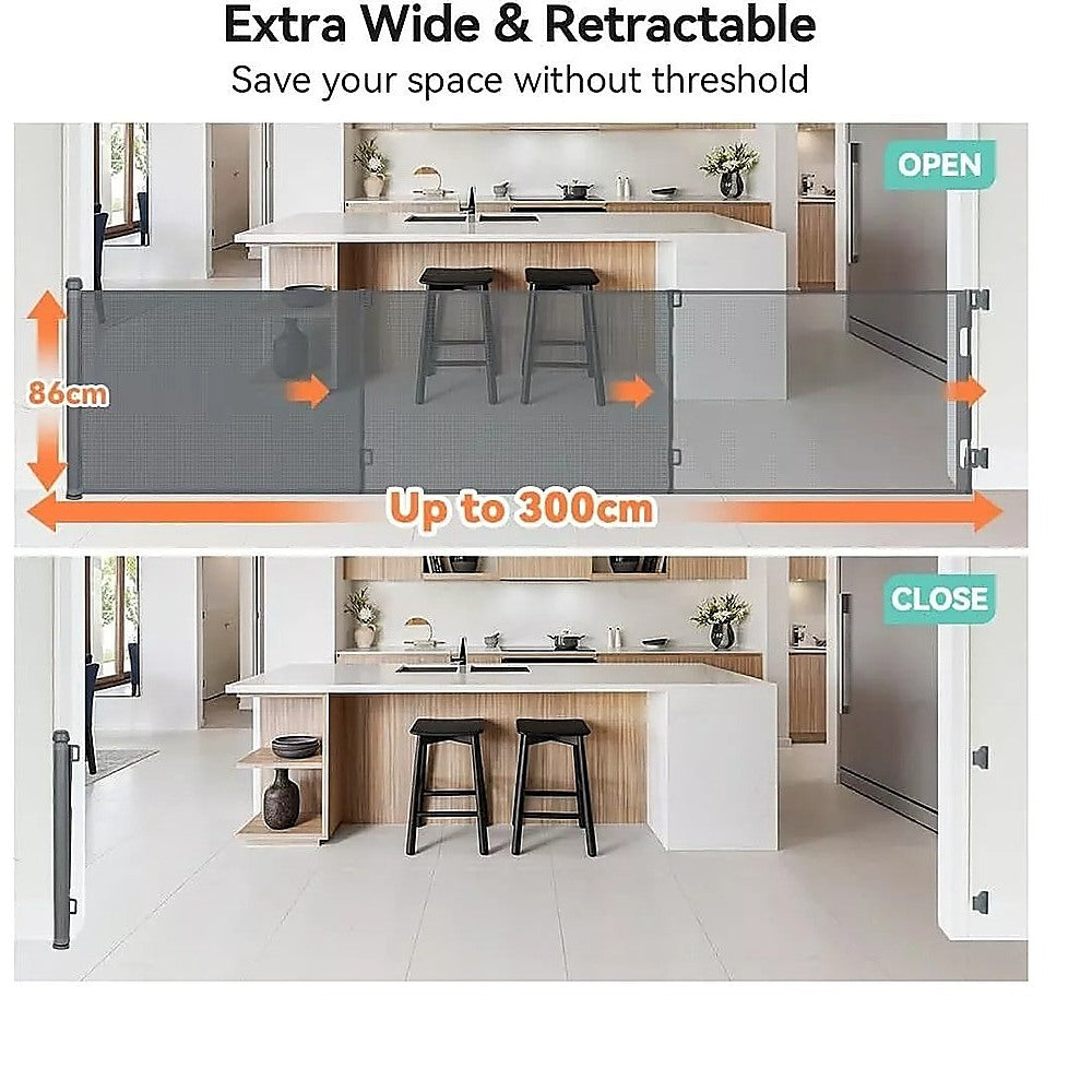 Create a safe and secure play area with this Retractable Baby Gate, designed for easy one-handed operation and effortless storage. Standing 86cm tall and extending up to 300cm wide, it's perfect for babies (624 months) and small to medium pets (1040 lbs).