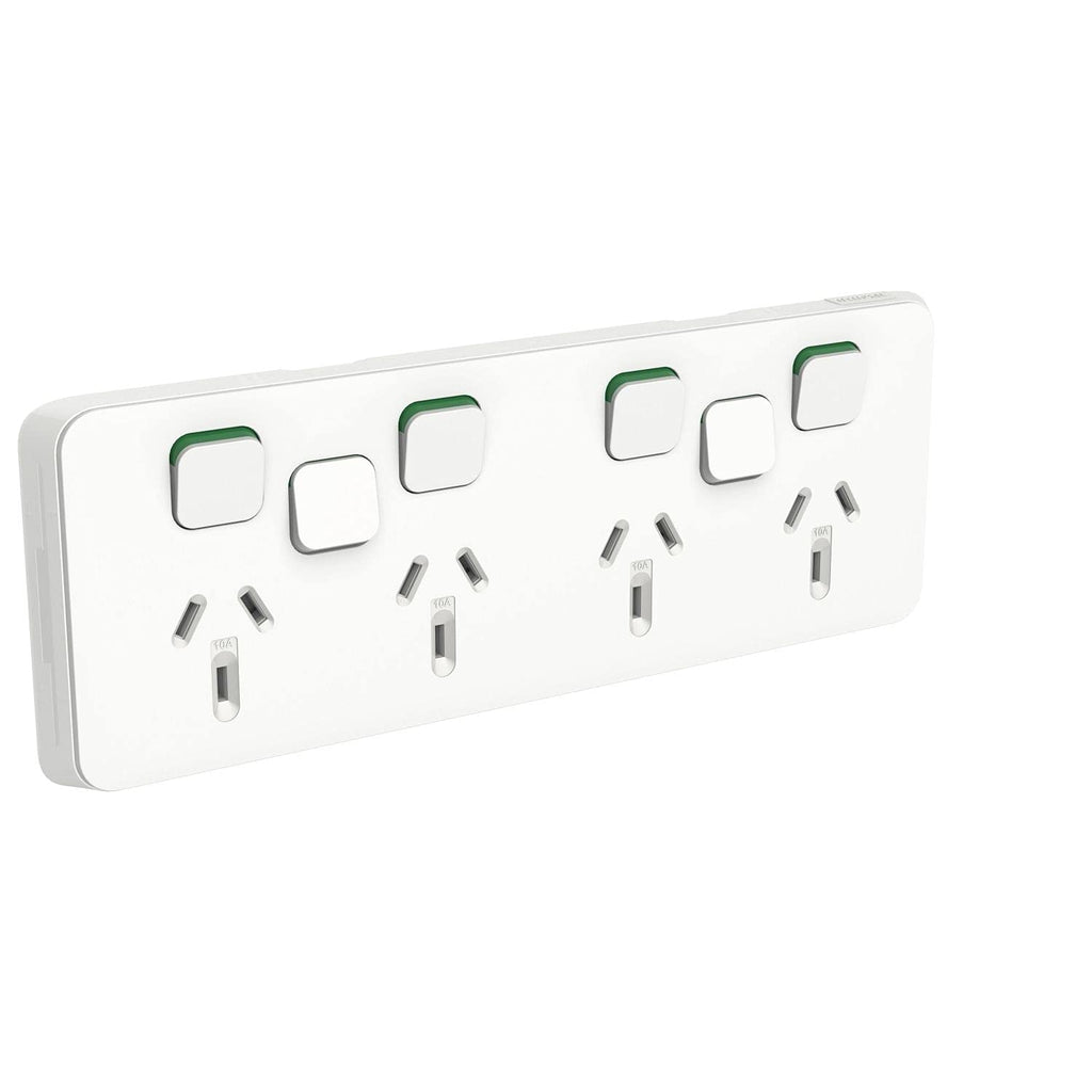 Clipsal 10A 250V Quad PowerPoint Socket with 2 Extra Switches Less Mechanism is ideal for multiple power outlets within a specific area. Protective flaps help prevent direct access to the screws after installation. "Socket grids are safe when installed. All sockets come with internal shutters providing additional protection. Perfect for the smart home office or entertainment areas.
