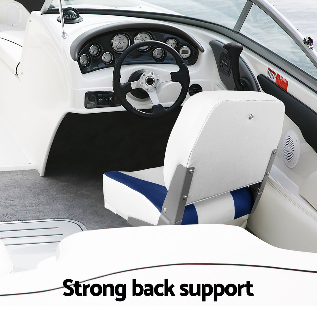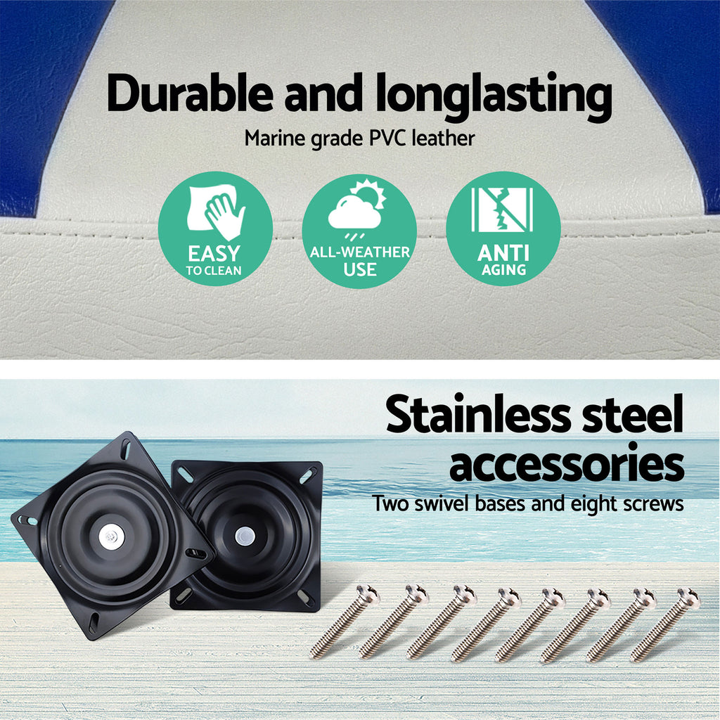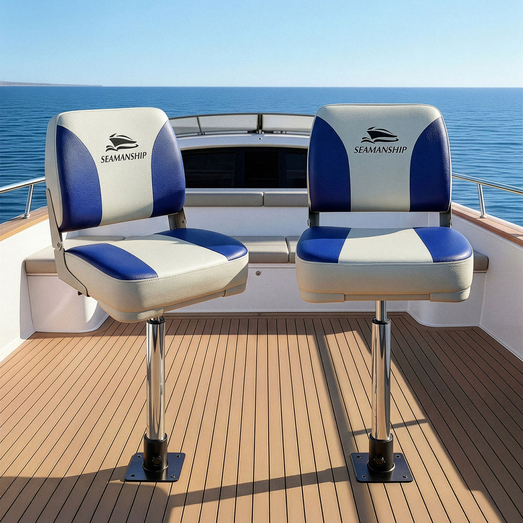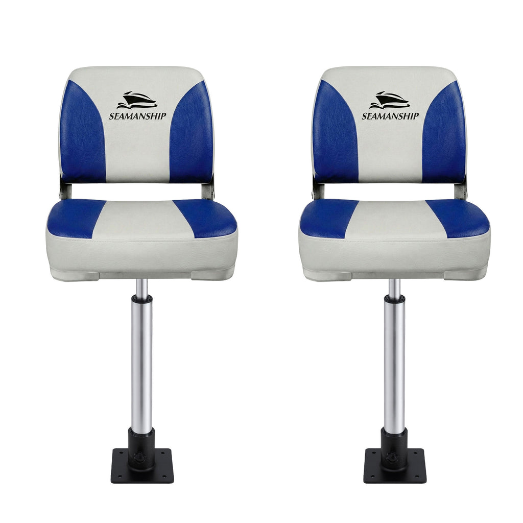 Seamanship 2X Folding Boat Seats with 2X Adjustable Pedestals 55–75cm Marine Swivel Low Back 13cm Padding White Blue