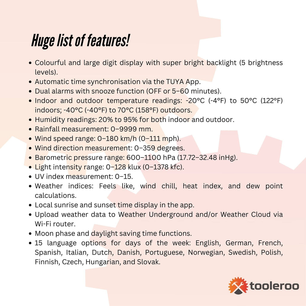 The Tooleroo Wireless 7-in-1 Weather Station is the ultimate WiFi Bluetooth Smart Weather Station, designed to provide full-function weather forecasting with precision and ease. Equipped with a comprehensive outdoor sensor, this digital clock delivers real-time data on temperature, humidity, wind speed, rainfall, UV index, and more, ensuring you're always prepared for changing conditions.