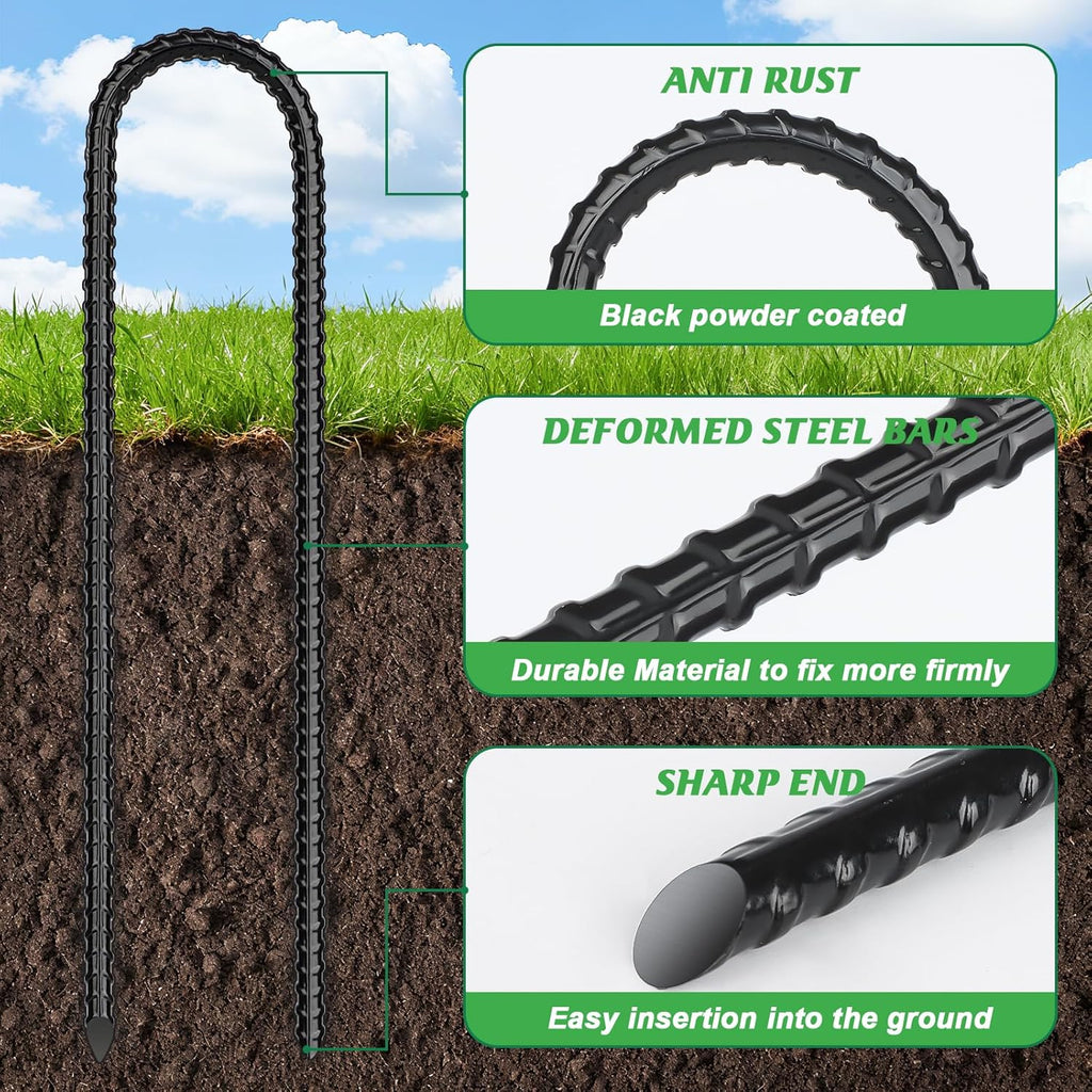 【KEEP YOUR KIDS SAFETY】Children's safety should be given priority. 12 inch U-shaped rebar stakes can prevent the trampoline from overturning or moving during use,and protect children from falling down and hitting the ground. For the safety of your baby and the peace of mind of parents, every parent should consider buying some extra things to fix your trampoline,camping tent or your child's football goal and swing.