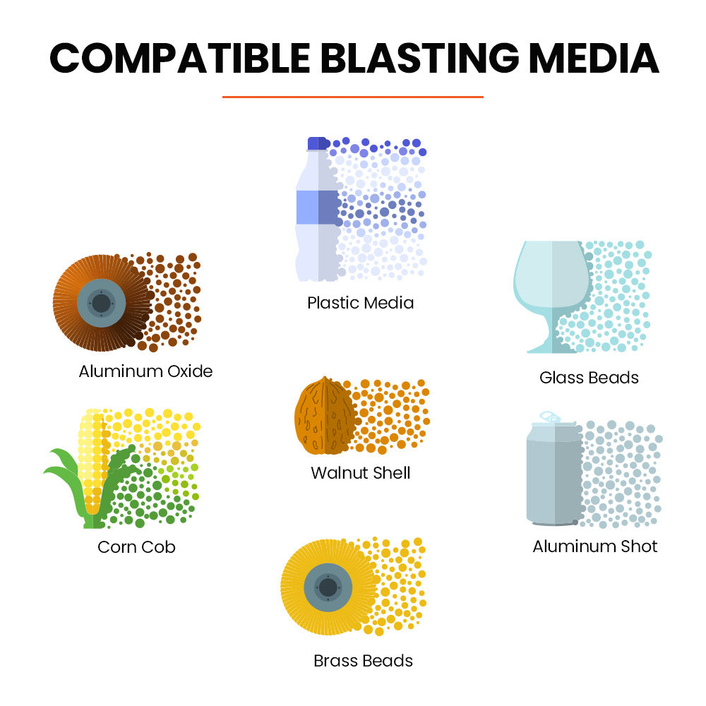 Sand Types: Glass bead, silicon carbide, alumina, walnut shell, brass bead