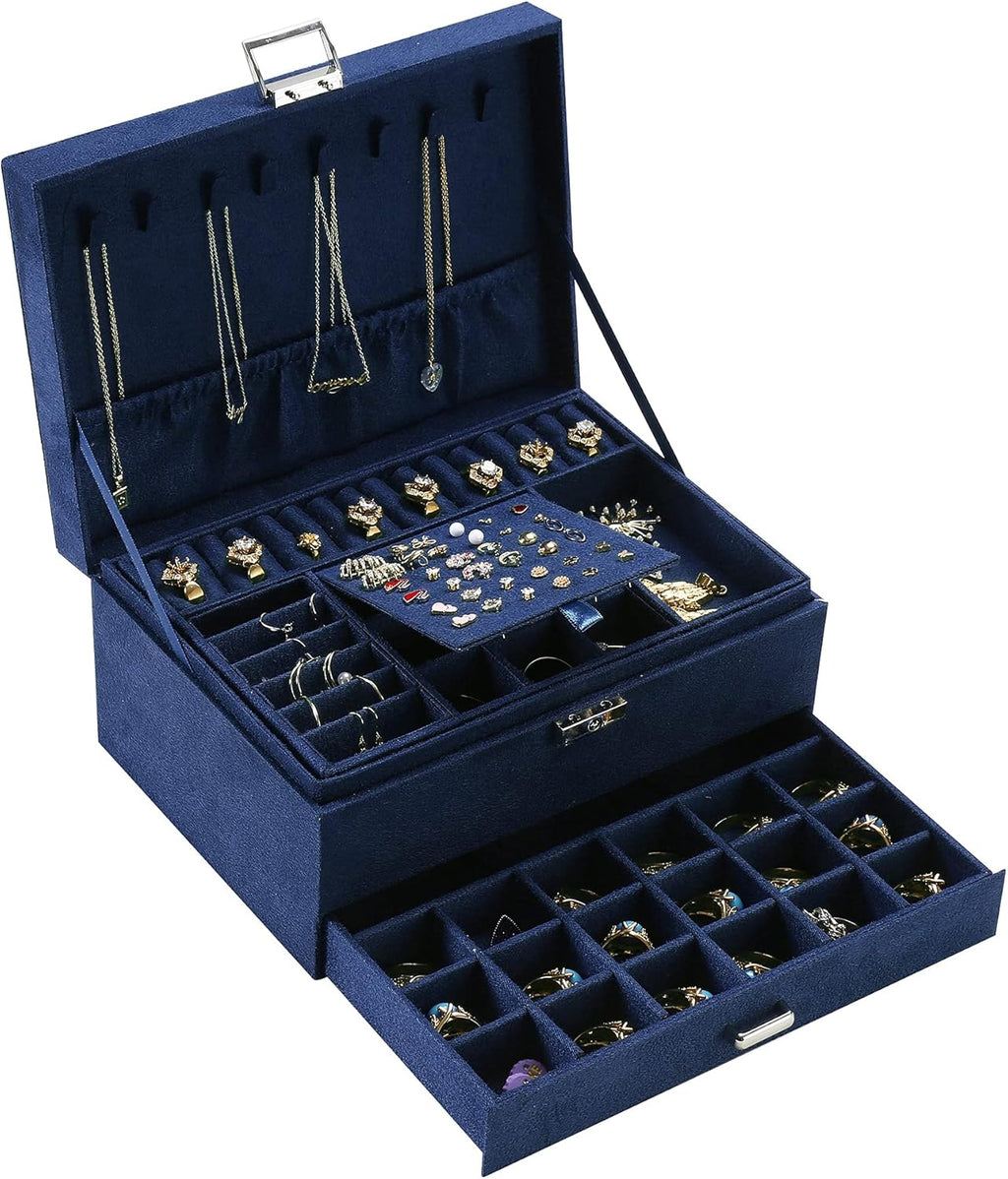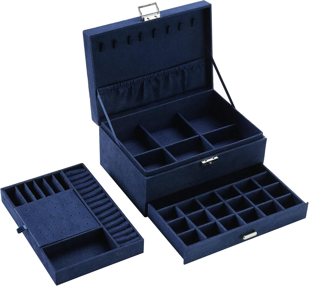 Create order and tranquility on your dressing table. Do you also suffer from earrings lying around or necklaces that get tangled With this elegant Large Jewelry Organizer for Women, you can give all your favorite accessories a permanent, stylish home. The luxurious design exudes class and is a beautiful addition to any interior, from bedroom to walkin closet. Luxurious protection and clever organization. This Velvet Jewelry Box is fully lined with soft velvet. This not only protects your valuables from dust but also prevents scratches and damage. The box has three layers with a thoughtful layout. The top offers space for rings and stud earrings, while the slideout drawers and compartments are perfect for larger items like sunglasses, watches, wide bracelets, and statement necklaces. Safe and organized. Thanks to the sturdy metal lock including key on the front, you can securely close the box. This keeps your jewelry safe from prying hands and prevents anything from falling out during moving or cleaning. Everything is easy to find at a glance, so you can immediately find the right set for your outfit in the morning. Product Specifications Type Velvet Jewelry Box with Lock Layout 3 Layers with various compartments Material Soft velvet and sturdy frame Color Blue Features With drawers compartments, lockable, scratchresistant Application Storing necklaces, rings, earrings and watches