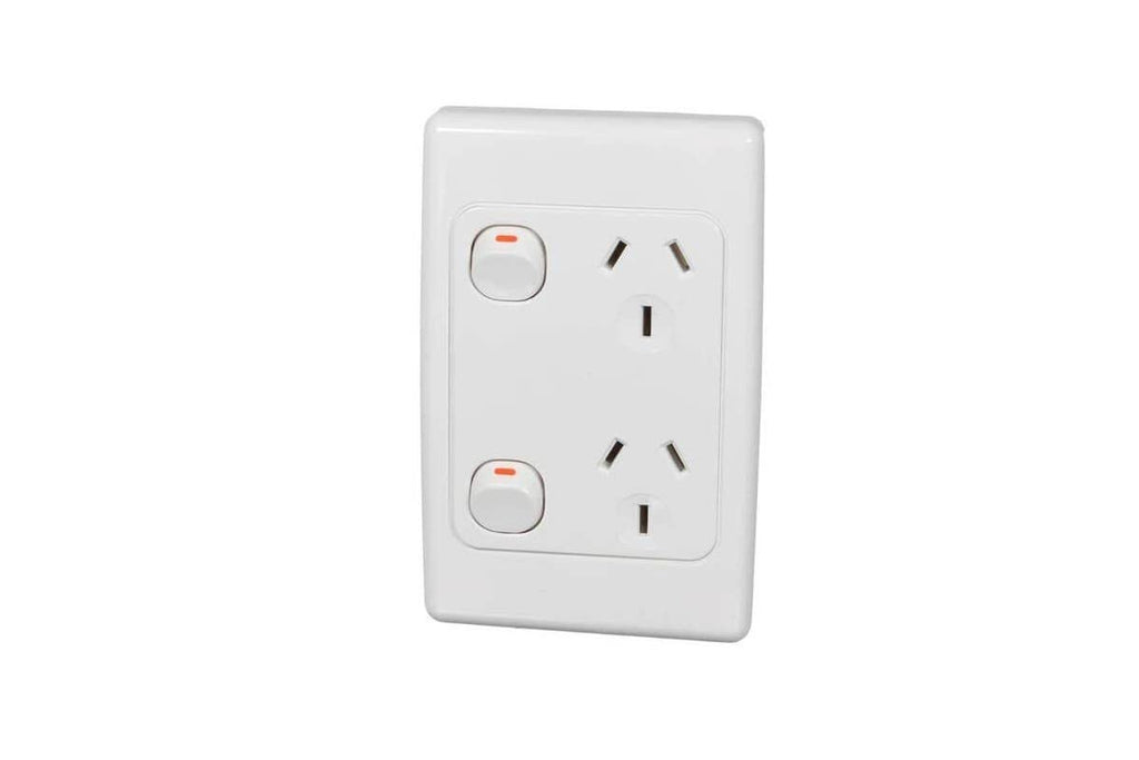 Clipsal by schneider electric twin switch socket outlet vertical with oval screw caps for extra adjustment on wall. Fits standard wall boxes and mounting accessories. Plates and dollies are made from uv stabilised polycarbonate to avoid discolouring to yellow. Standard colour is white. Sockets have shutters and are double pole.