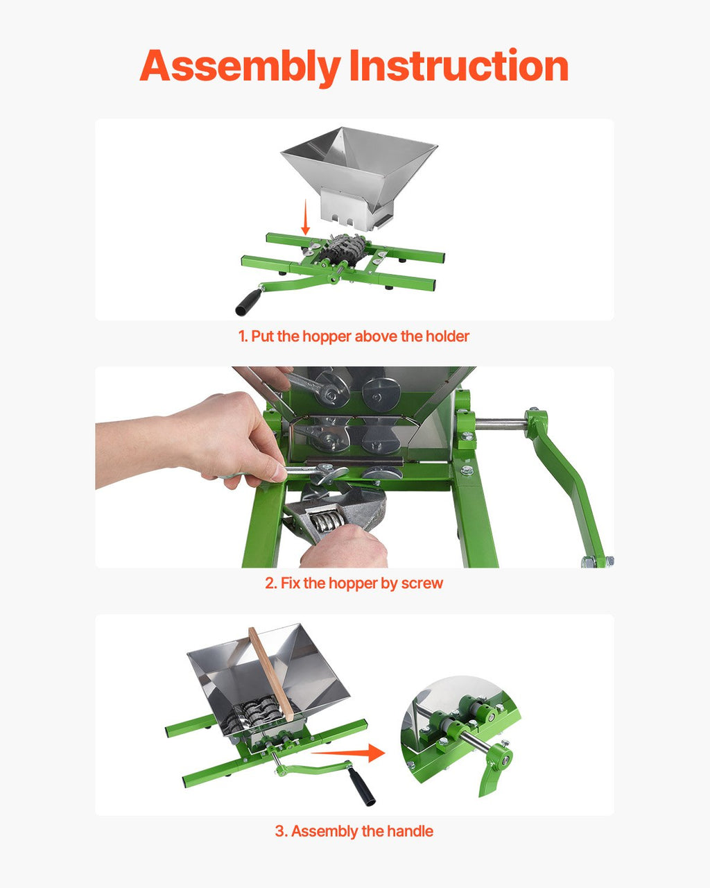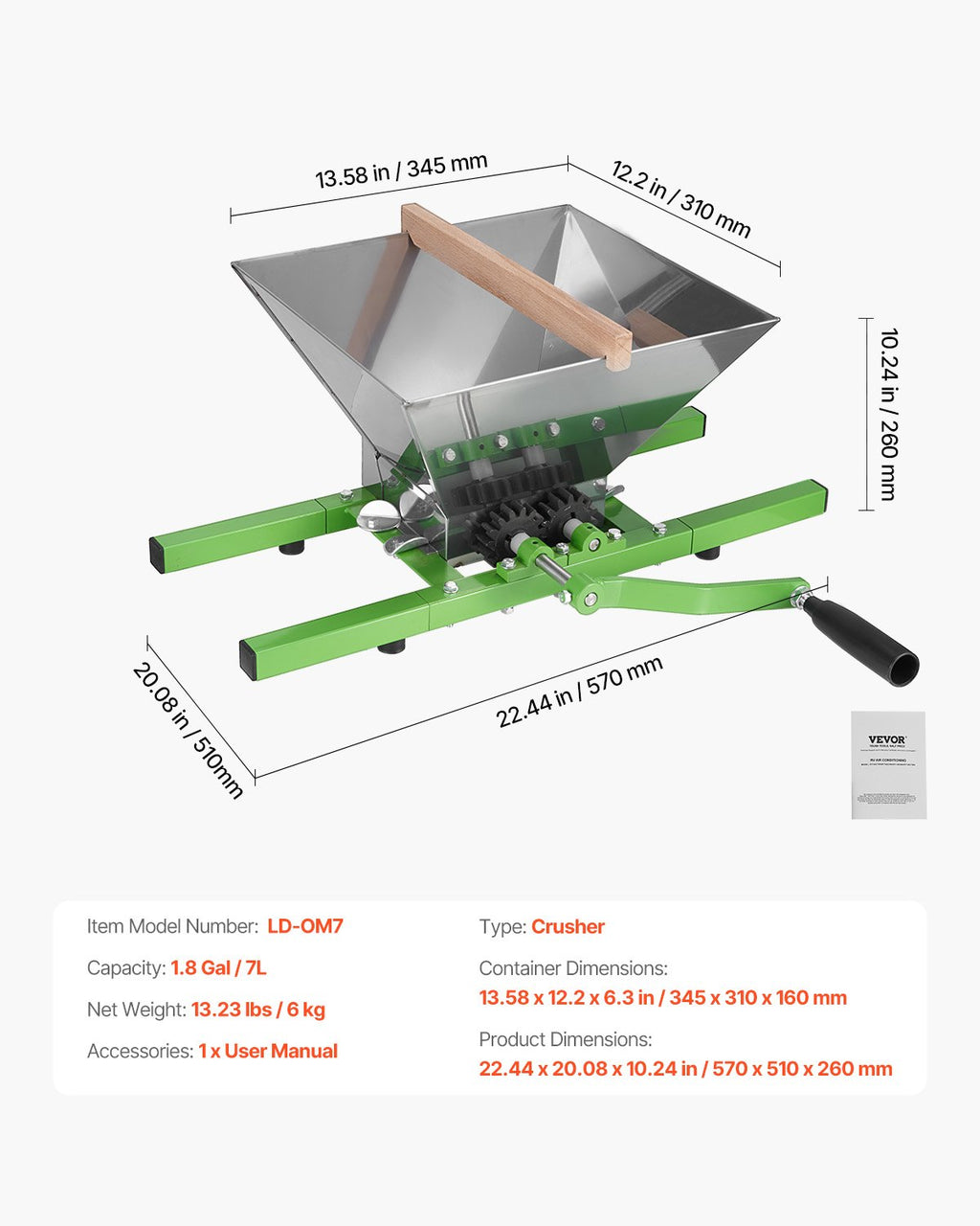 VEVOR 1.8 Gal/7L Fruit and Apple Crusher, Large Manual Grinder, Stainless Steel Fruit Scratter Pulper for Wine Cider Apple Grape Pressing, with Roller Handle for Kitchen Home, Green