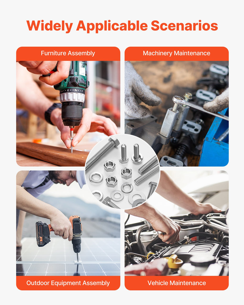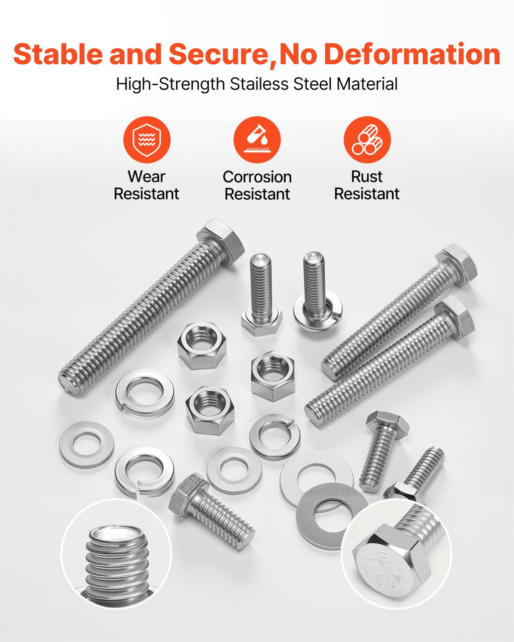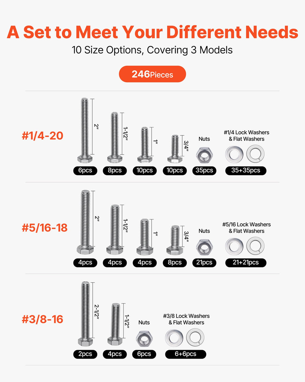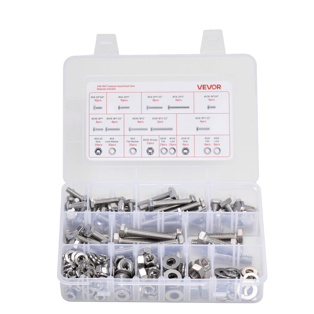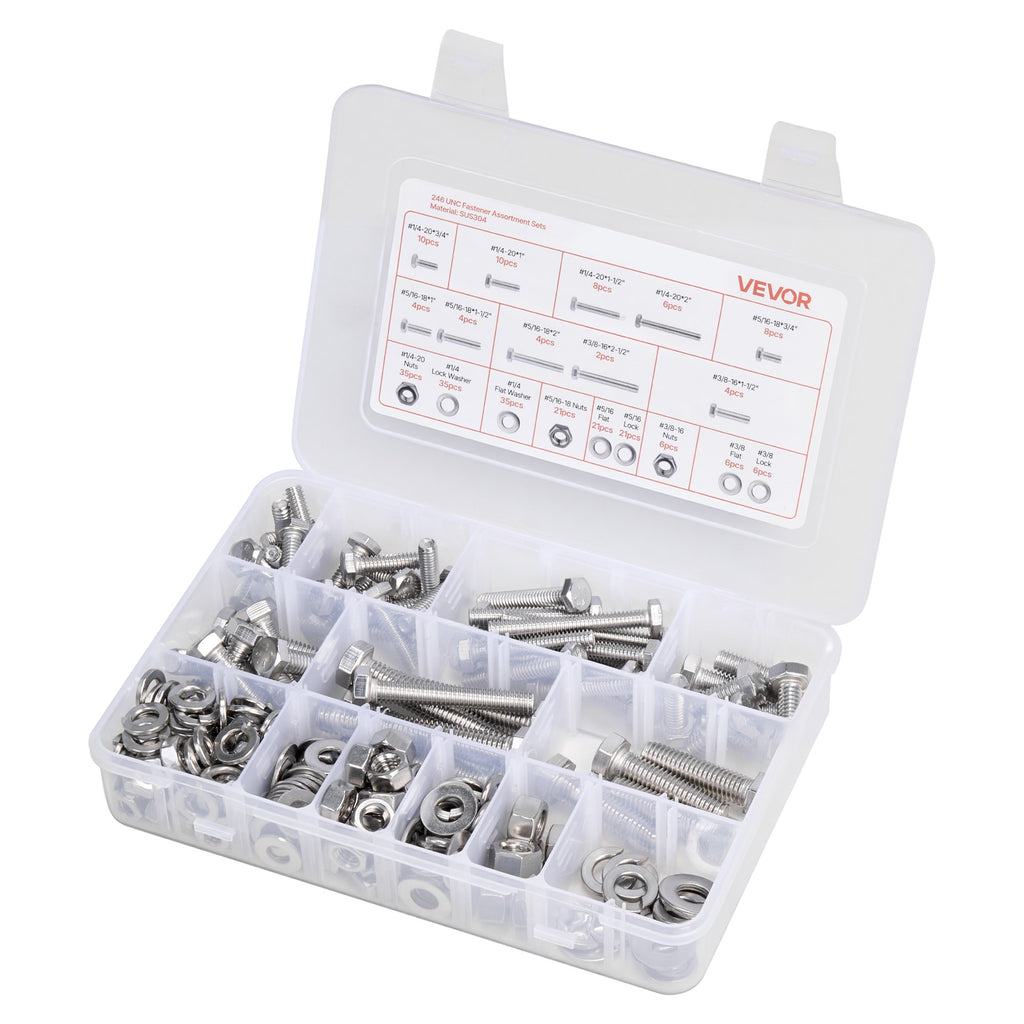 VEVOR 246 Pcs Bolts and Nuts Assortment Kit, Imperial Screws and Flat Washers, Stainless Steel 1/4-20,5/16-18,3/8-16, Spring Lock Washers for Furniture / Equipment /Vehicle Assembly with Case