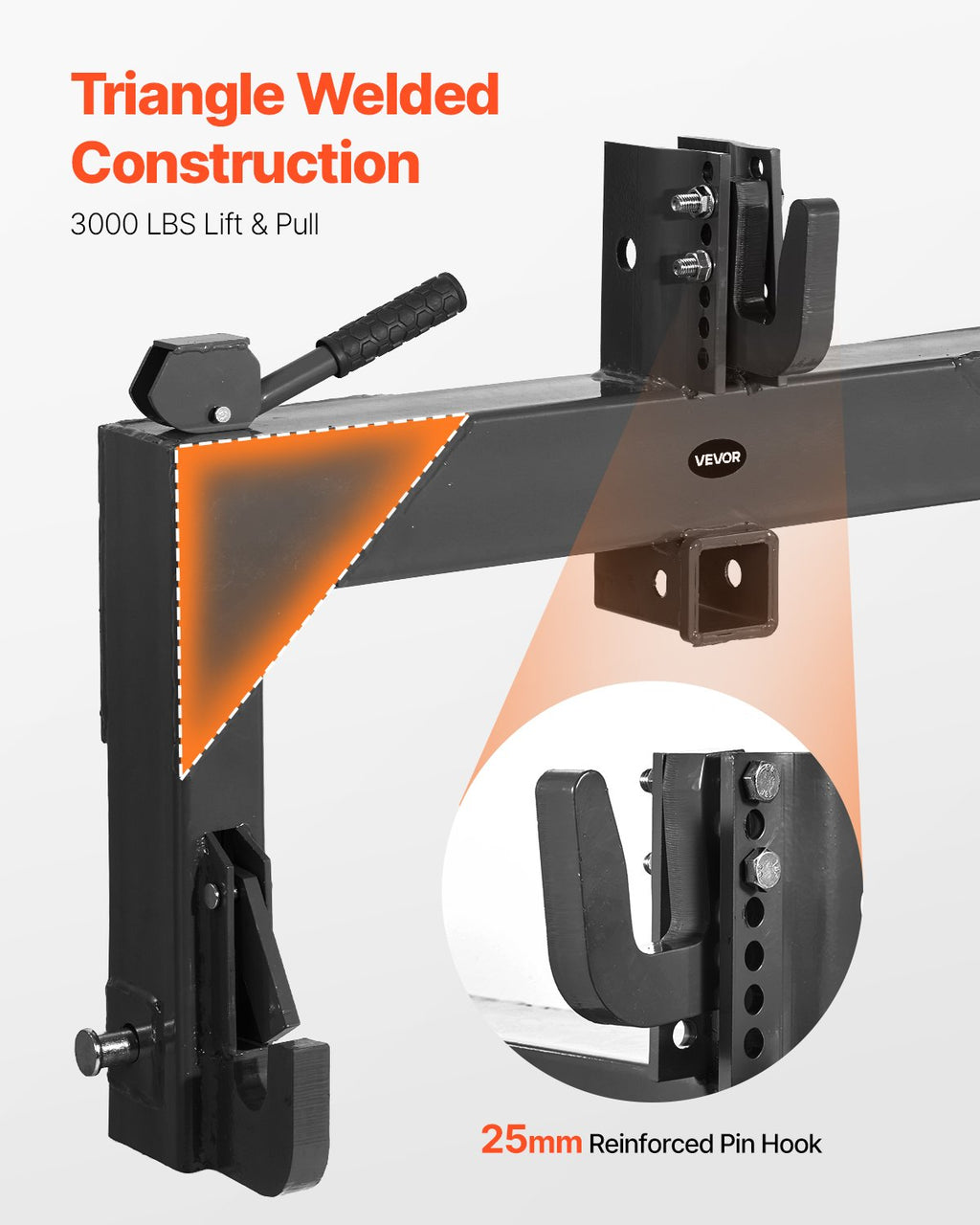 VEVOR 3-Point Quick Hitch with 2 in Receiver, 3000 Lbs Lift Capacity, 3-Pt Hitch with 5 Level Adjustable Bolt, Adaptation to Category 1 & 2 Tractor, Heavy Duty 3 Point Attachments, Black