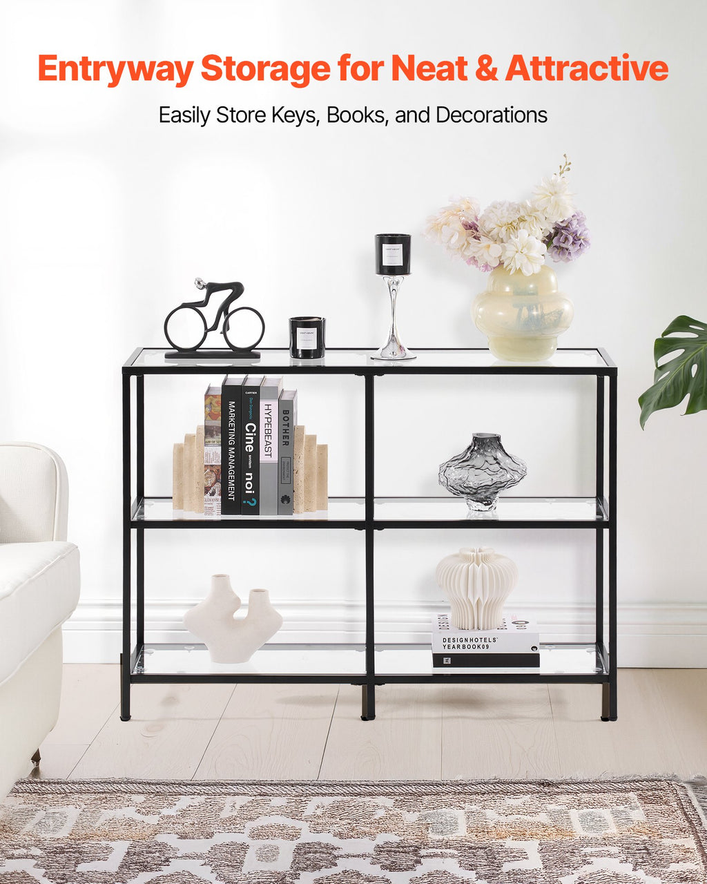 VEVOR 3-Tier Glass Console Table, Modern Rectangle Sofa Side Table with Tempered Glass Top and Iron Legs, Golden Consloe Desk with Anti-Tip Device for Living Room, Hallway, Entryway, Foyer, Black