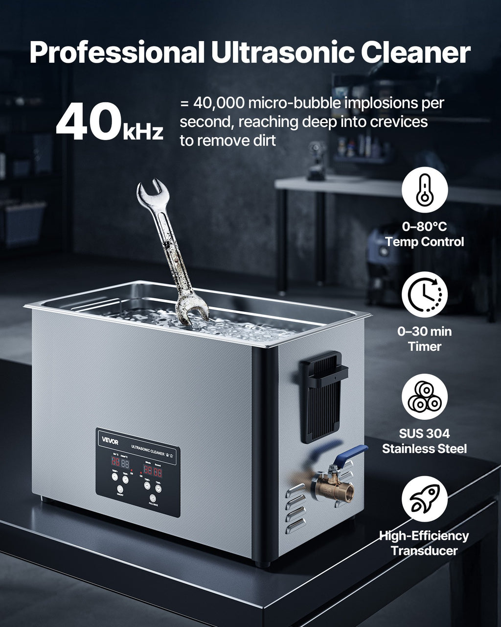 VEVOR 30L Ultrasonic Cleaner, Professional Ultrasonic Cleaner Machine with Cleaning Basket & Digital Display, 480W Stainless Steel 40kHz Industrial Cleaning Machine for Parts, Carburetors, Instruments