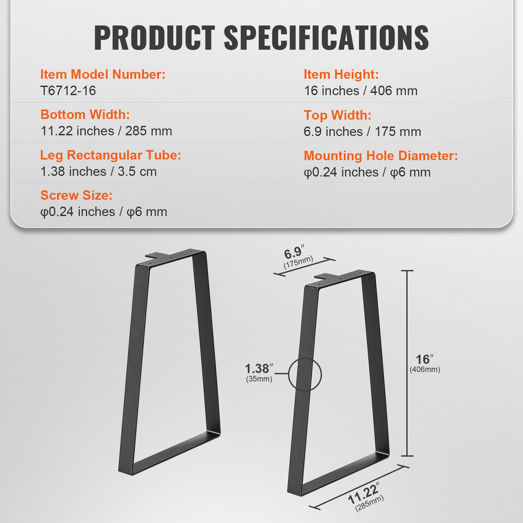 VEVOR 406.4MM Trapezoid Steel Table Legs, Replacement Furniture Legs Set of 2 for DIY Coffee Tables, Modern Desks, Bench, Night Stands, Sofa, Max Load 181.4KG Heavy Duty, Quick Instalation Legs Black